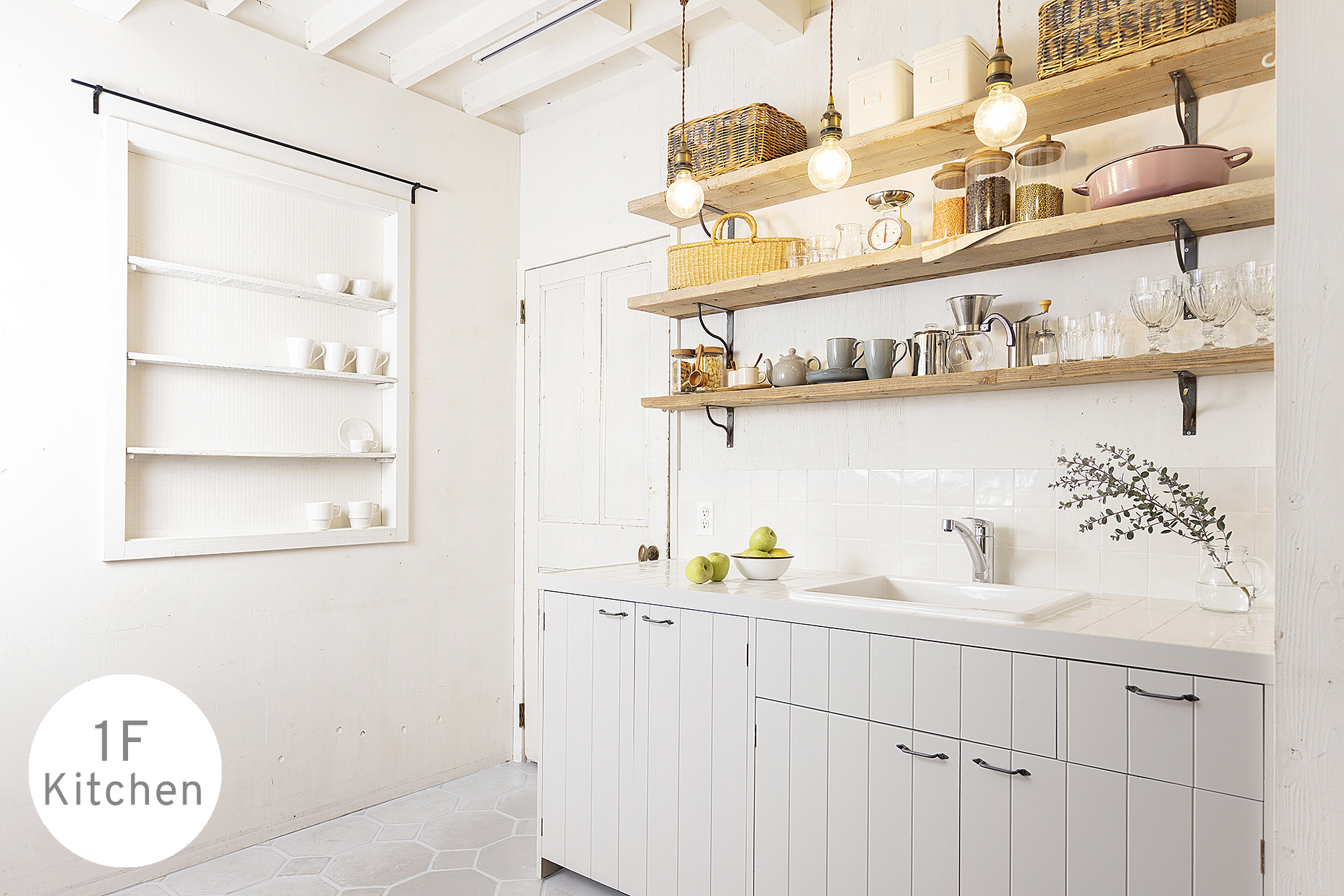 白を基調にナチュラルな木の温もりを添えた、キッチンシーンが映える空間。