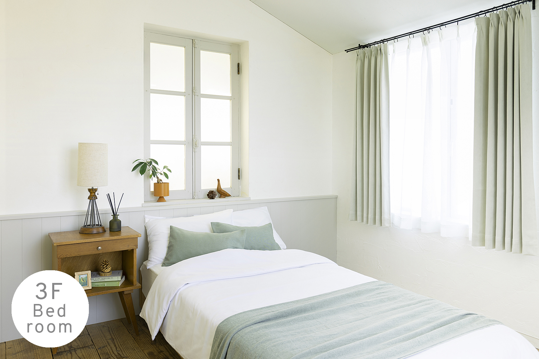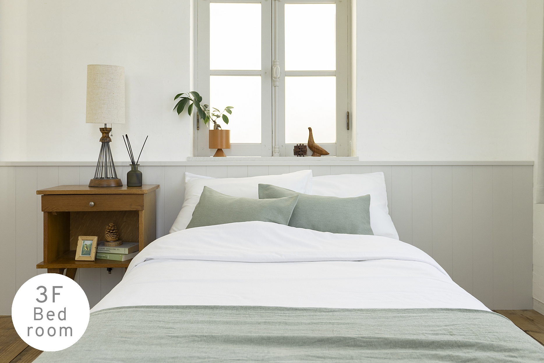やわらかな自然光に包まれる、ベッドルームシーンの最上階空間。